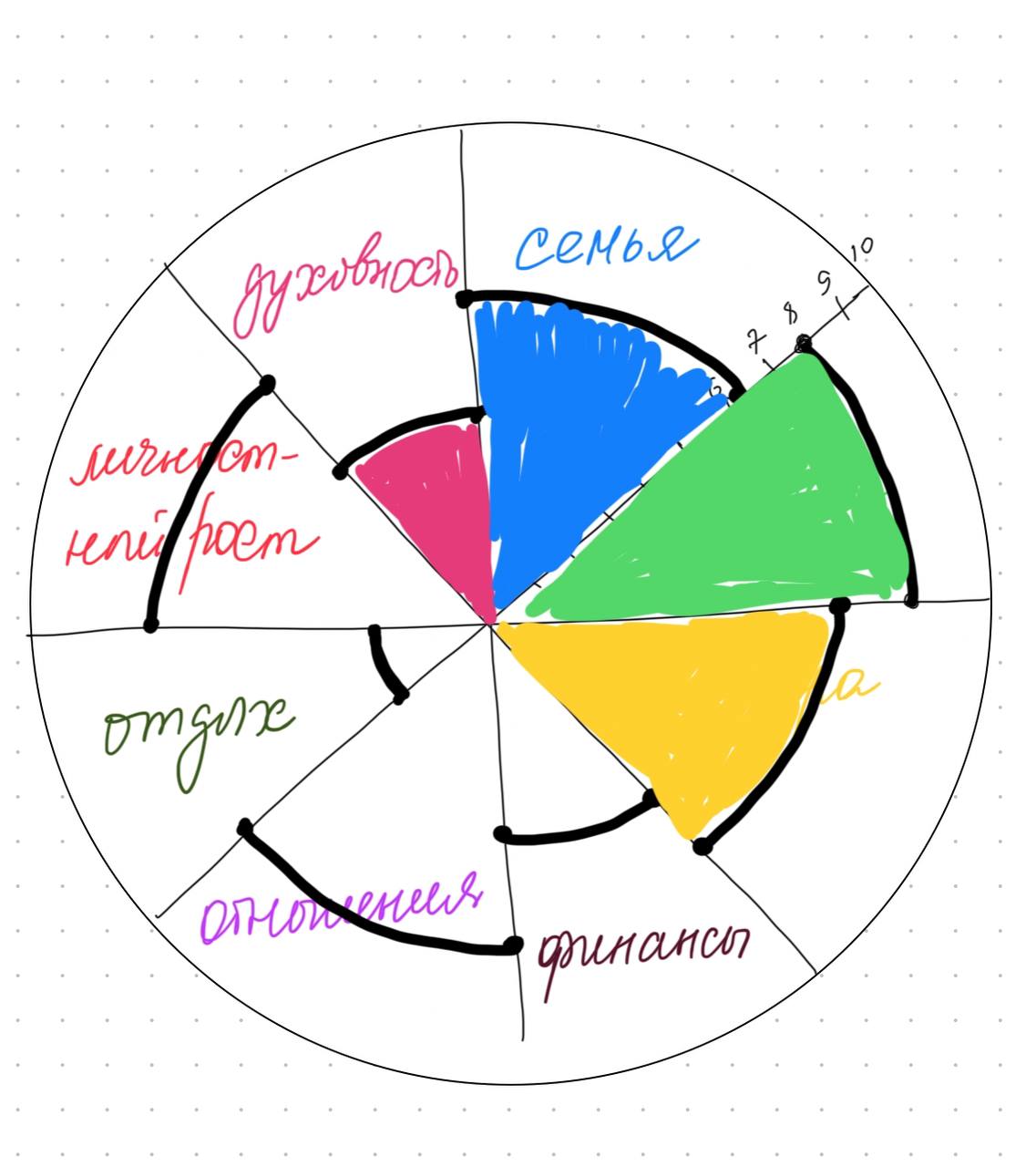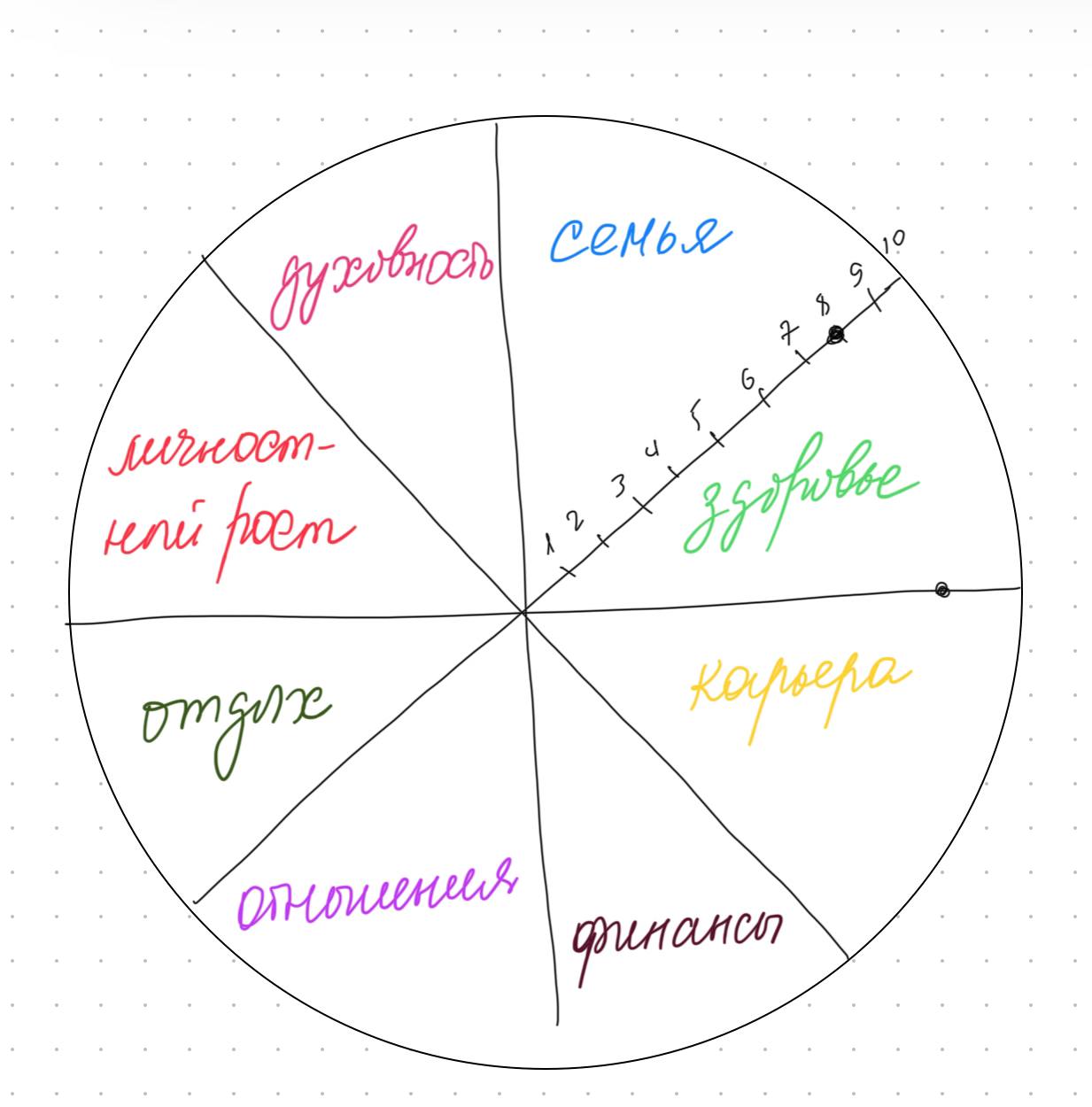 Это простая и наглядная техника, которую я часто использую в работе с клиентами. Она помогает увидеть свою жизнь целиком и понять, какие области сейчас требуют вашего внимания и заботы.